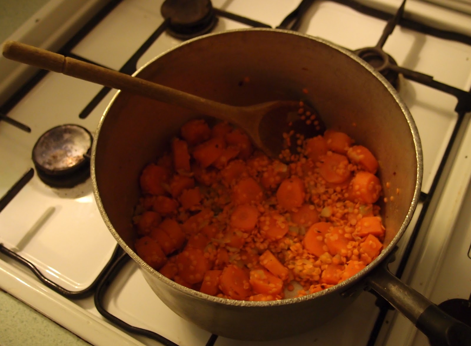 4) Add stock and bring to the boil then simmer for 30minutes (or until lentils and carrots are cooked)
